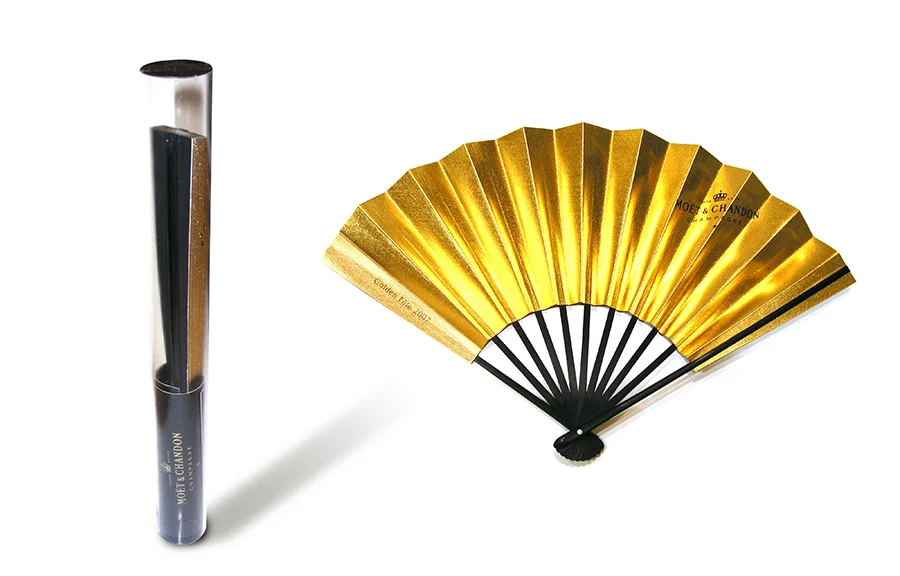 Inserted a golden Japanese fan together with an invitation into an transparent acrylic cylinder.